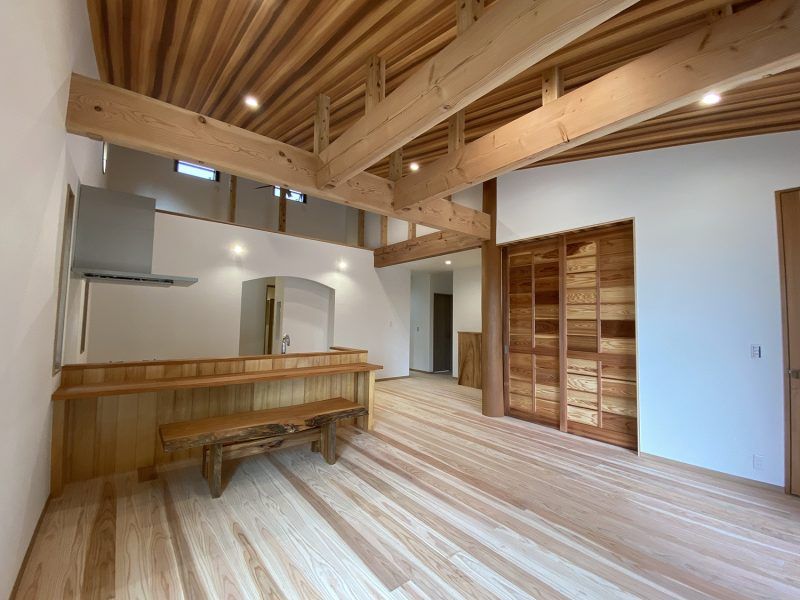 ロフトがある平屋の家 Written by adc on 2023年10月4日. Posted in 戸建、施工事例. 目を惹く特徴的な形の杉梁があるLDK おしゃれなランドリールーム ロフトがある子供部屋 特別な秘密基地がある子供部屋にお子さんも大喜び!