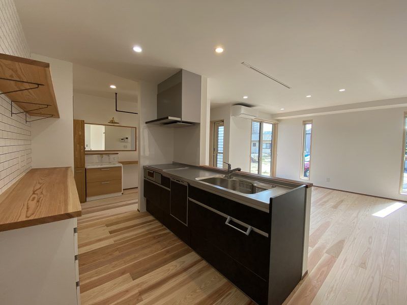 ⽊の格⼦と⼀枚板カウンターがある平屋住宅 Written by adc on 2024年7月17日. Posted in 戸建、施工事例. ブラック×木目でかっこいい雰囲気の外観デザイン。 ⽞関の⽬隠しにもなる⽊の格⼦。 とてもおしゃれな外観デザインです。 キッチン後ろに⼀枚板カウンターを採⽤。 ⽊のぬくもりが感じられるキッチン空間です。 ランドリールームにも⼀枚板のカウンターを採⽤。 表情豊かな⽊の雰囲気に癒されます。